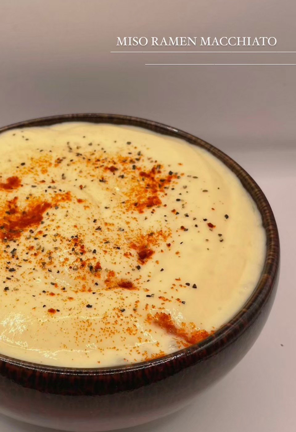 エスプーマの下には、チンゲンサイ、煮卵、チャー シューが入っており、ちぢれ麺との相性が抜群の 博多の新名物「味噌マキアート」をぜひ一度ご賞 味ください。