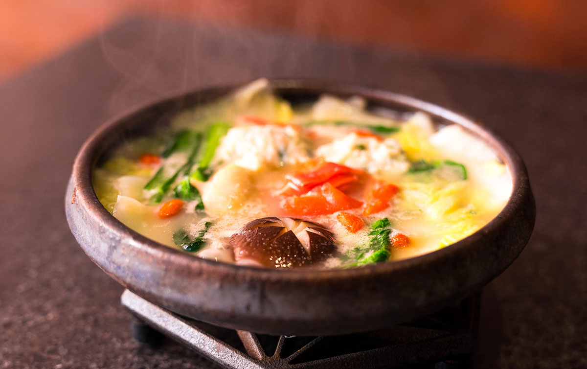 数種の味噌をブレンドして仕上げた、クリーミー な泡に包まれたスープエスプーマと、豚骨を少し 加えた味噌ベースのスープ。混ぜながら食べ進め ると二層のスープが絡み合い、味わいが変化して 2 度美味しい。自家製七味で味の変化を味わうのも おすすめです。